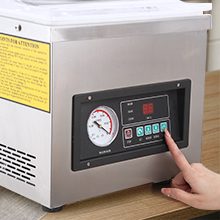 • Microcomputer Control: Equipped with an intuitive digital panel, vacuum gauge, operating adjustment and sealing temperature zones, and emergency stop button, which can accurately display results in real time. Press the vacuum box cover and the machine automatically starts working and completes the entire process.