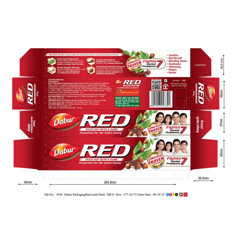 • Dabur Red Paste provides protection from 7 dental problems: cavities, gingivitis, plaque, toothache, bad breath, yellow teeth, plus weak teeth, and gums..