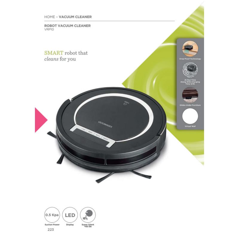 Kenwood Smart Robot Vacuum Cleaner 2-in-1 Vacuuming Smart Drop Proof Technology Virtual Wall Ideal for Pet Hair Hard Floor and Carpet 0.5 Suction Power super silent 65 VRP10.000BK