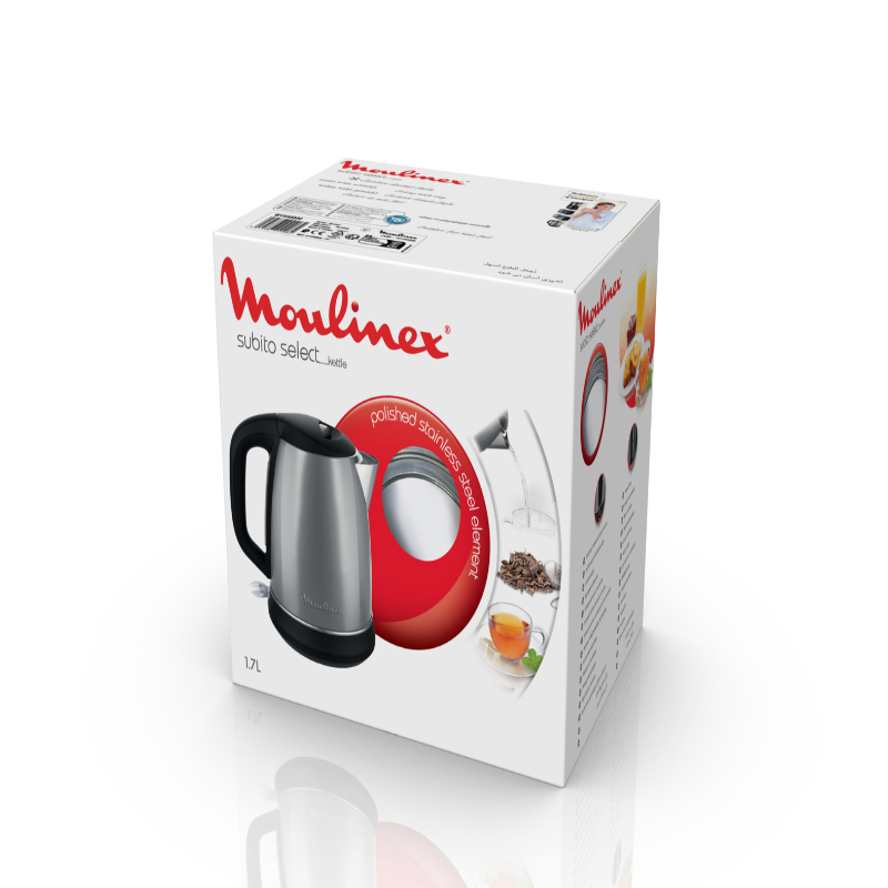 The Subito Select Electric Kettle by Moulinex was made to bring the pleasure back to breakfast and tea time. This durable stainless  steel kettle offers a generous 1.7 L capacity with enough for any occasion, 2400W of power for quick boiling with auto-off for total peace of mind, an easy-open lid and water level window on the handle for effortless filling and cleaning, and more.
