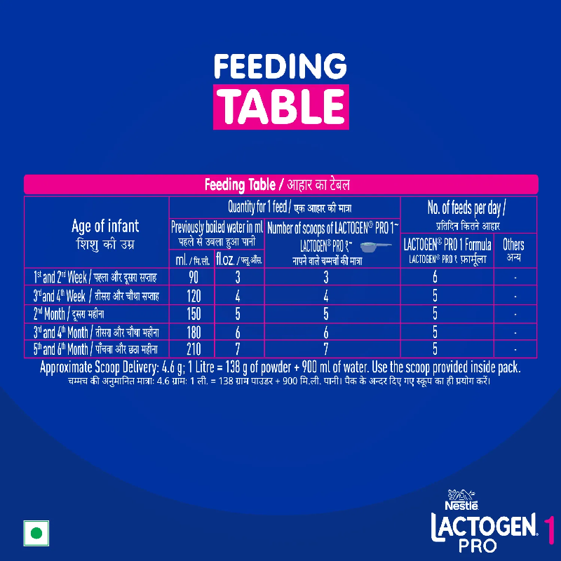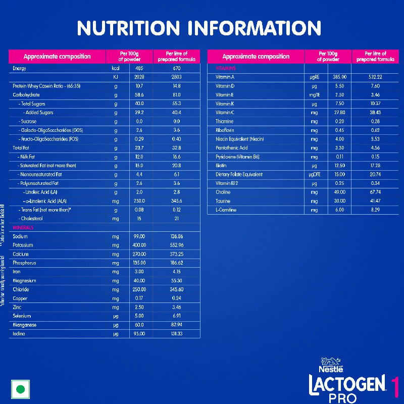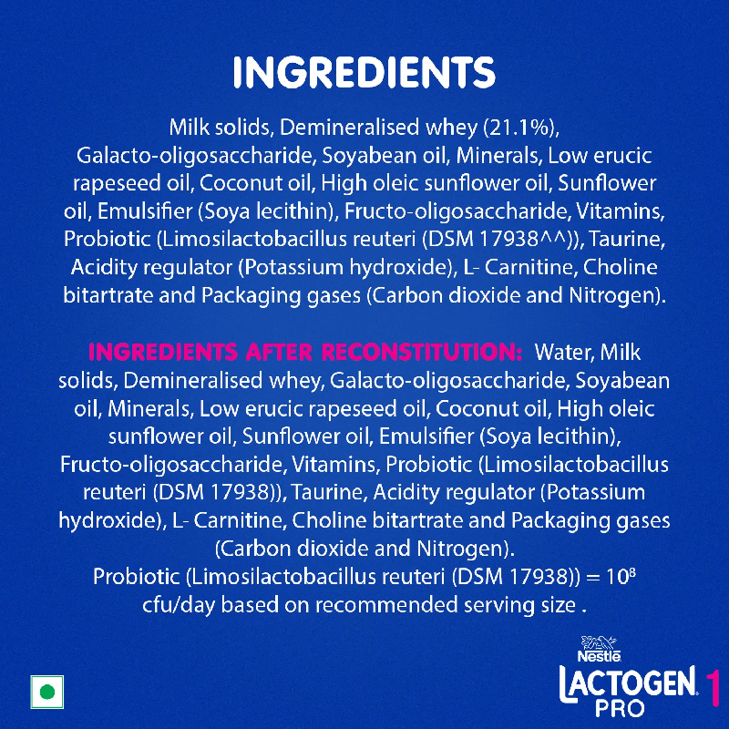 Nestlé LACTOGEN Pro 1 Baby Milk Powder is a spray-dried infant formula designed for infants from birth to 6 months. It contains probiotic L. reuteri alongside prebiotic fibers (GOS & FOS). It also has whey protein, known for its easy digestibility. With a legacy spanning over 155 years, Nestlé brings its expertise in infant nutrition, backed by science and research. Important Notice: Mother’s milk is best for your baby. STORAGE CONDITIONS: Close lid of this tin tightly after each use and always store this container in a cool, dry and hygienic place. Use only enclosed scoop. Important Notice: Mother’s milk is best for your baby.
