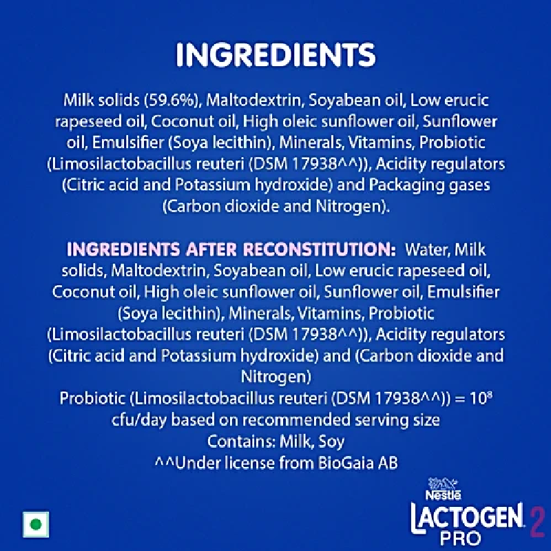 Nestlé LACTOGEN Pro 2 Baby Milk Powder is a spray-dried infant formula designed for infants from birth to 6 months. It contains probiotic L. reuteri alongside prebiotic fibers (GOS & FOS). It also has whey protein, known for its easy digestibility. With a legacy spanning over 155 years, Nestlé brings its expertise in infant nutrition, backed by science and research. Important Notice: Mother’s milk is best for your baby. STORAGE CONDITIONS: Close lid of this tin tightly after each use and always store this container in a cool, dry and hygienic place. Use only enclosed scoop. Important Notice: Mother’s milk is best for your baby.