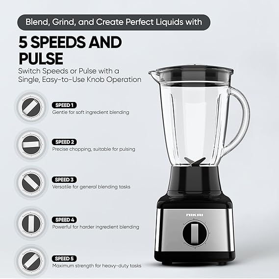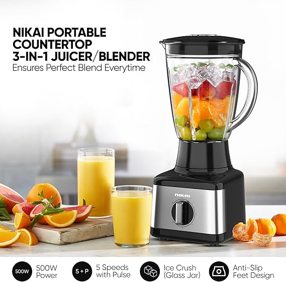 The NIKAI 3-in-1 Blender is a versatile and powerful kitchen appliance.” With a power of 500W, stainless steel blades, and a combination of plastic and stainless steel body, it’s designed to blend and grind with ease. The blender comes with three jars, including a glass blending jar, a plastic blending jar, and a plastic grinder. This provides you with options for different ingredients and quantities. You’ll also appreciate the 5-speed settings with a pulse function, allowing you to adjust the blending speed according to your preferences. And the anti-slip feet design ensures stability during use, so you can blend with confidence. For your convenience, the AC power requirement is 220-240V at 50/60Hz. This means you can use it in various countries without worrying about compatibility.