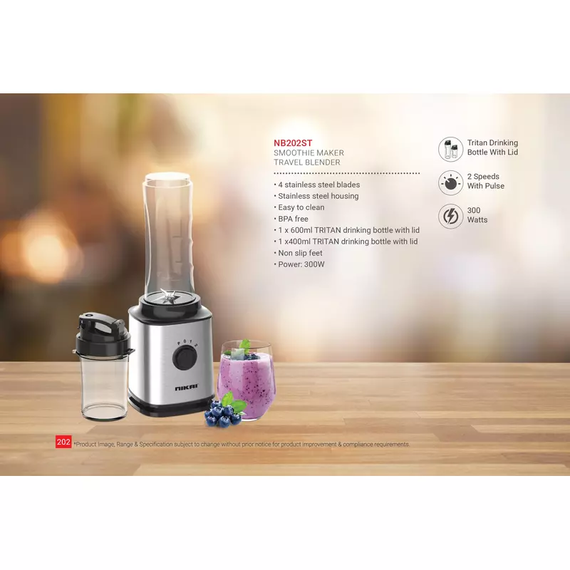 Nikai Blender Smoothie Maker with 600ml Tritan Bottle and 400ML Tritan Bottle 300W NB202ST 4 Stainless Steel Blades And Housing Tritan Drinking Bottle With Lid 2 Speed With Pulse