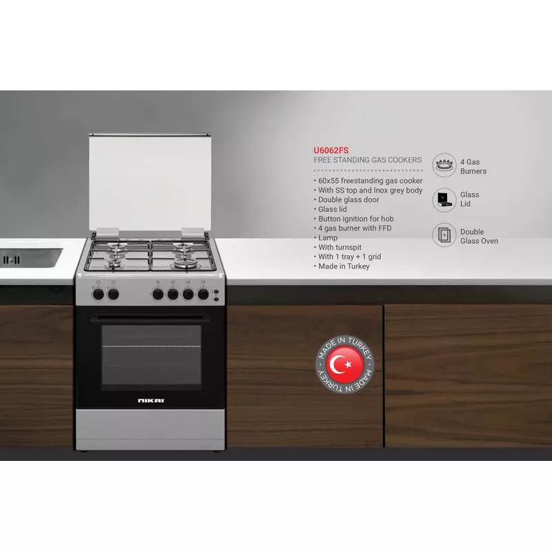 Nikai Oven Cooking Range 4 Burner Double Glass Door 60x55cm U6062FS Glass Lid Button Ignition For Hob With Lamp Stainless Steel Top And Body