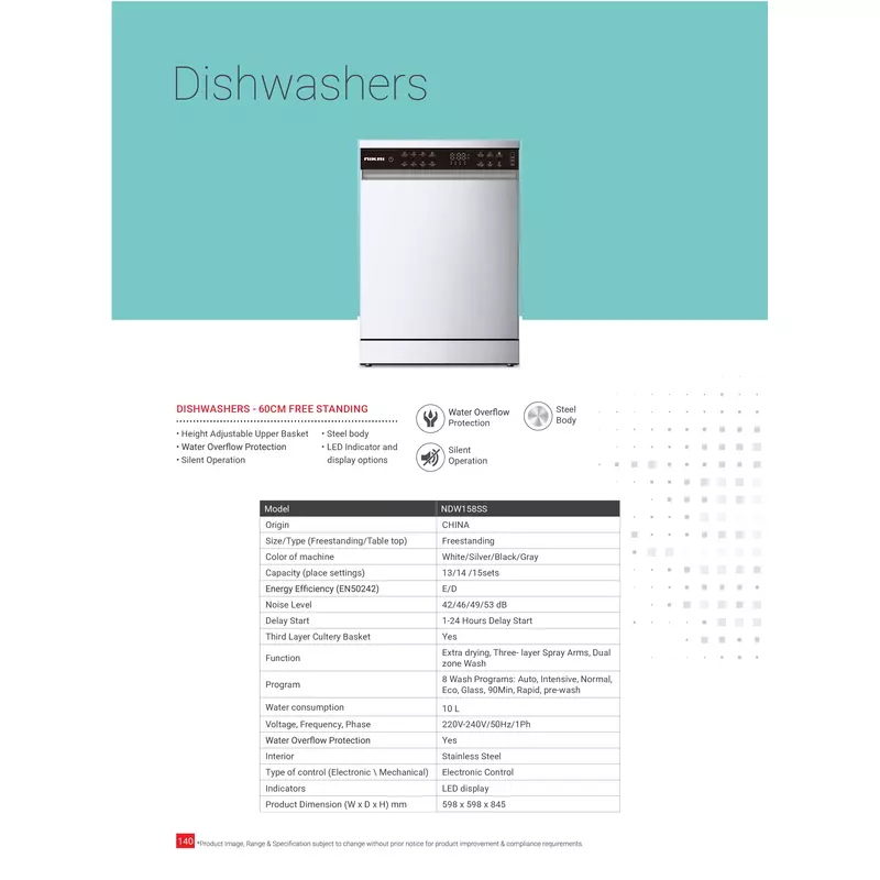 Nikai Dish Washer 60Cm 14 Plates NDW158SS Free Standing 8 Programs Dimension 598*598*845mm