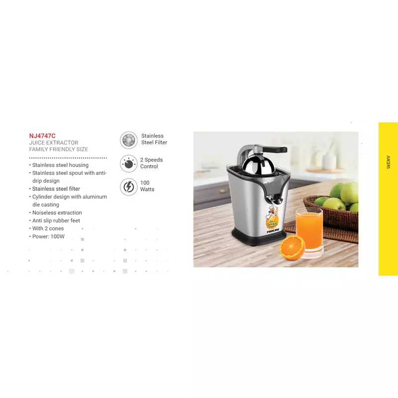 Nikai Citrus Juicer Steel 100W NJ4747C Stainless Steel Filter With 2 Cones 2 Speeds Control