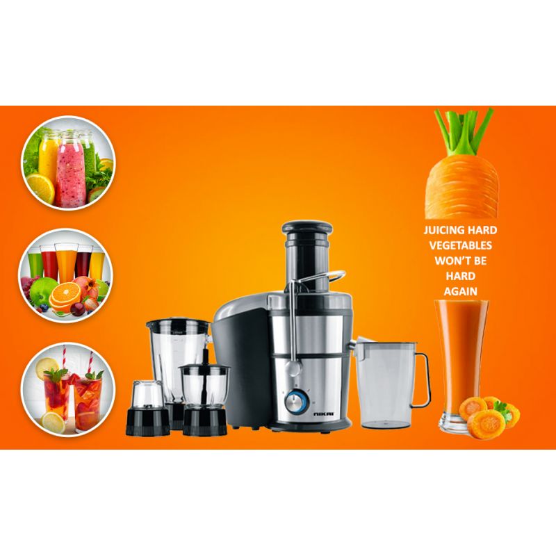Nikai electrical appliances have the best build, using the highest grade materials. Get the highly efficient all-in-one Nikai Food Processor that multi-tasks and reduces the need for multiple kitchen machines. It has a 1.1 Ltr glass juicer jug, a 2 Ltr extra-large pulp container, a Meat mincer, and a Full Apple Juicer that allows you to make several servings of juice and glass jars for grinding and mixing. Our appliance has a stainless steel filter, stainless steel housing with two different speed settings, and a pulse function. The food processor is easy to clean. Just plug it off, detach all parts and wipe it clean with water.