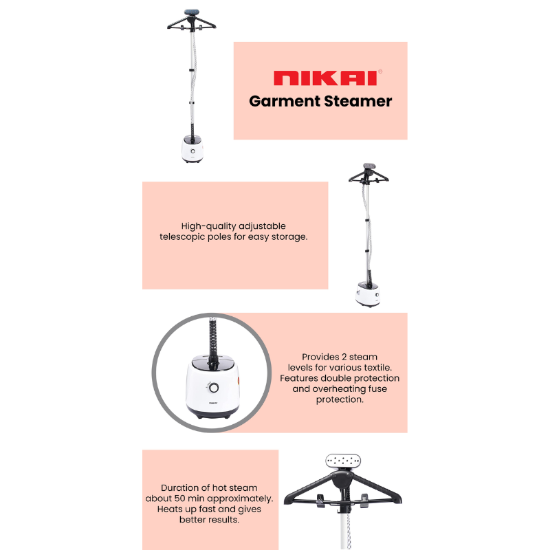 This Nikai Garment Steamer Is Excellent. Sturdy. Easy To Put Together. Fast. Does A Great Job On Thicker Fabrics Perfect For Daily Use. Heats Up Fast And Gives Better Results Than The Ones More Expensive I Had Before. I Definitely Recommend It Instead Of An Iron. It Has A Suit Hanger System With Adjustable Telescopic Pole 2 Systems Levels. It Evaporates Or Heats Faster Than The Other Brand, But The Hose Might Easily Twist Because Of The Heat.