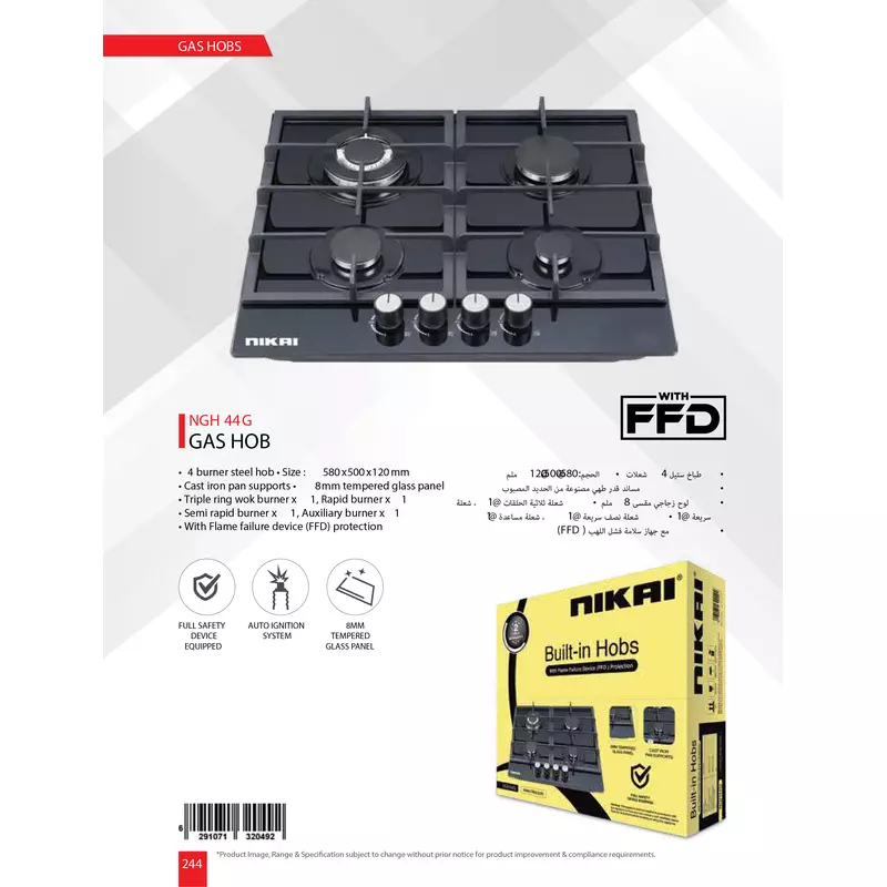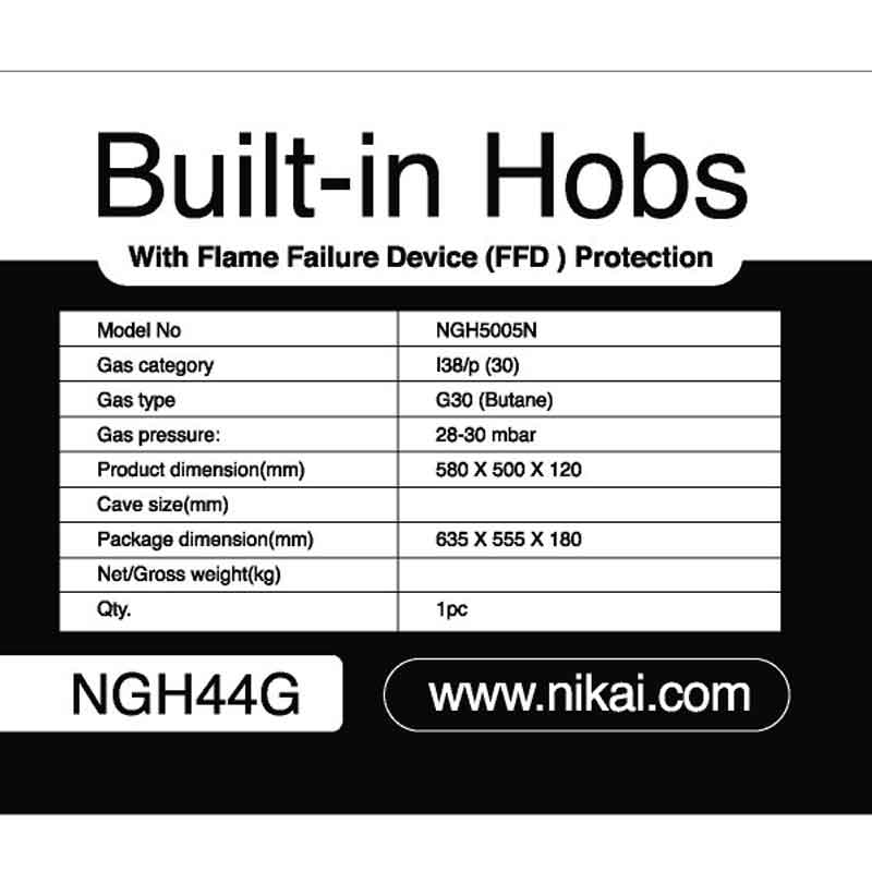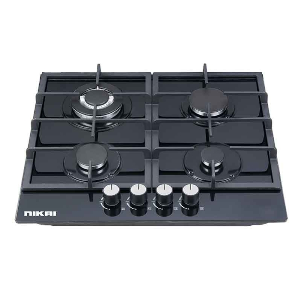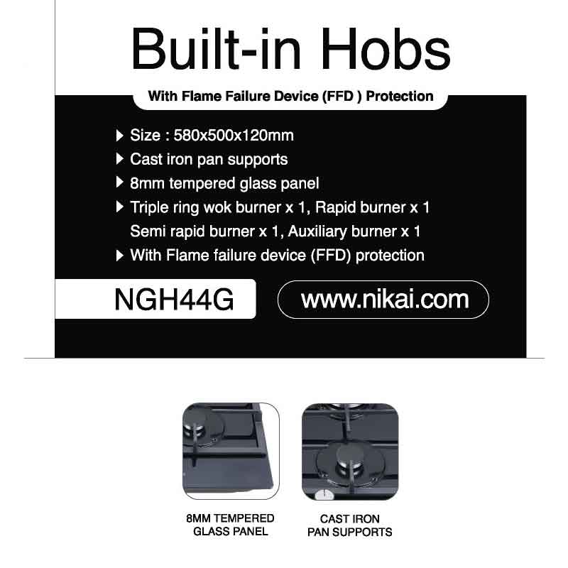 Nikai Gas Cooker 4 Burner Glass 8mm Tempered Built in Hob 580x500x120mm NGH44G Auto Ignition System Cast Iron Pan Supports Triple Ring Wok Burner