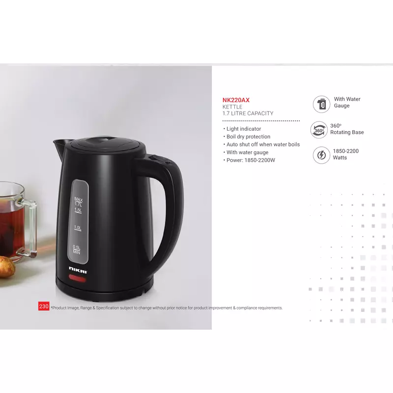 Nikai Jug Kettle 1.7L Plastic With Water Guage 2200W NK220AX Automatic Shut Off Boil Dry Protection With Indicator