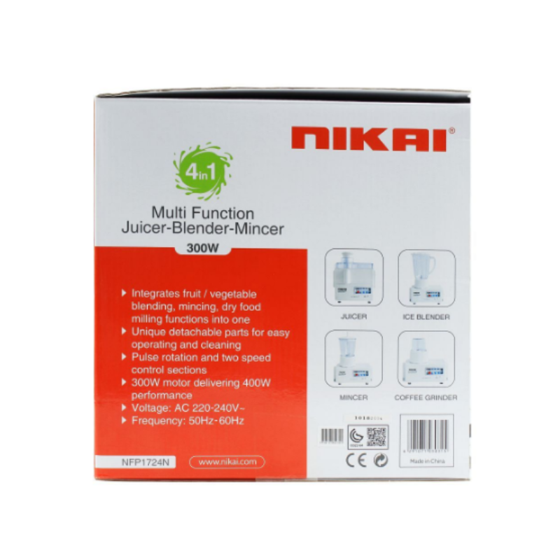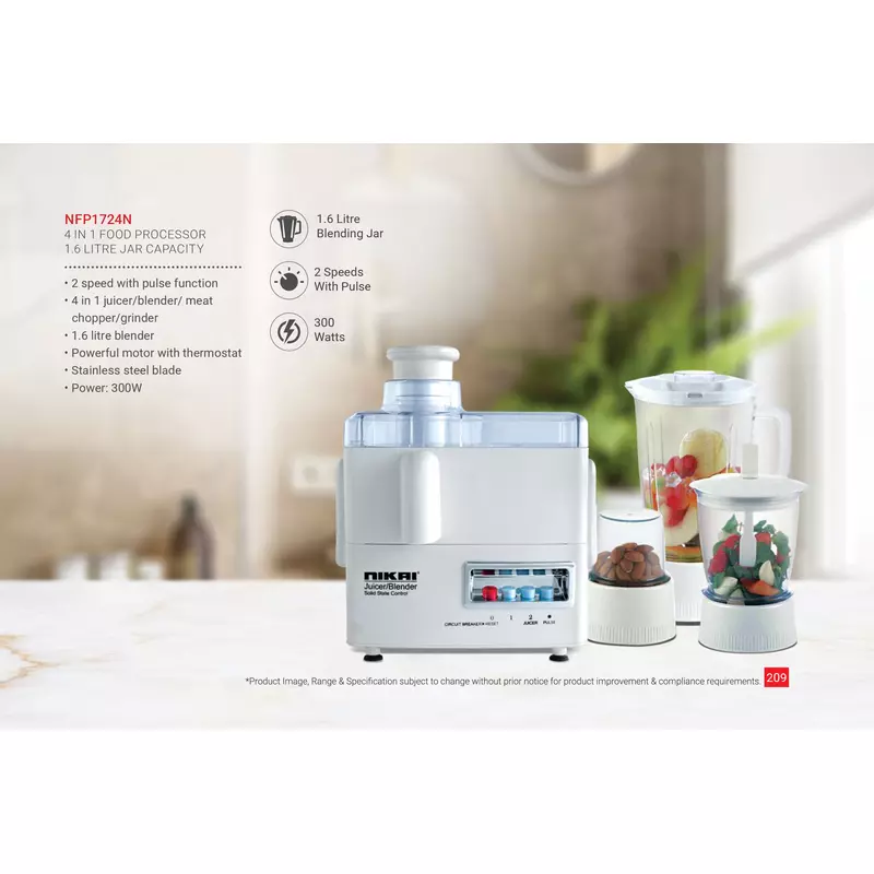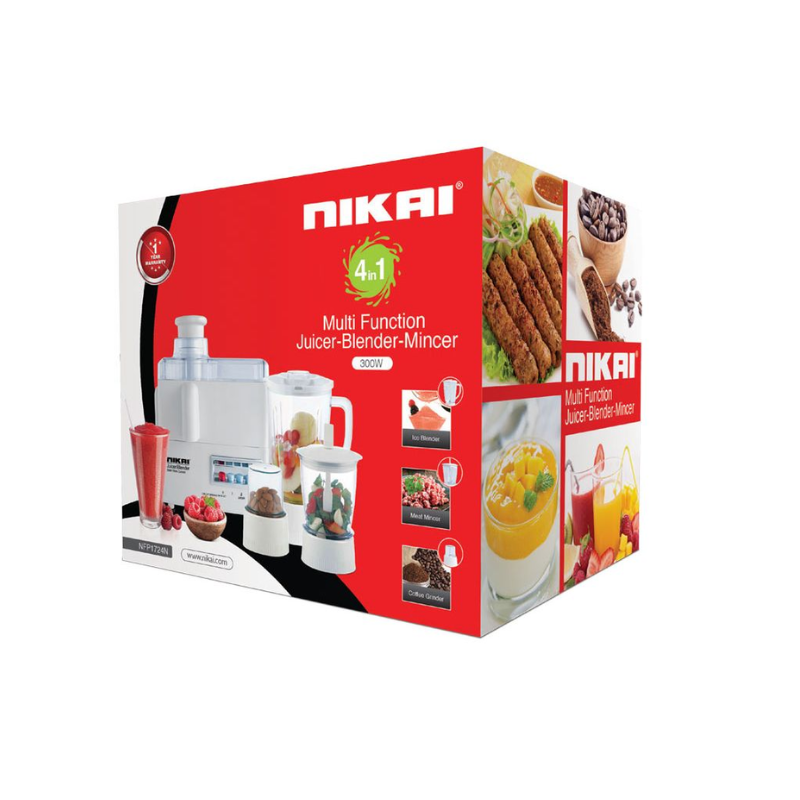 Nikai Juicer Extractor 1.6L 4 in 1 Juicer Blender Meat Chopper and Grinder 300W NFP1724N 2 Speed With Pulse Function Powerful Motor With Thermostat Stainless Steel Blades