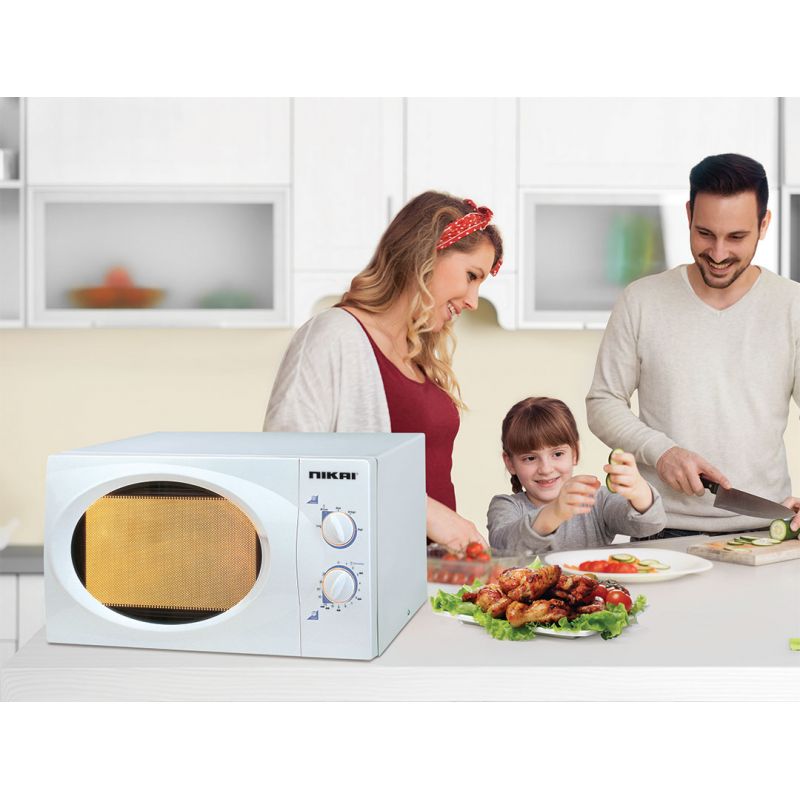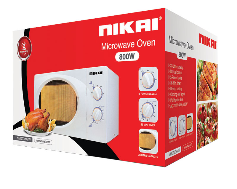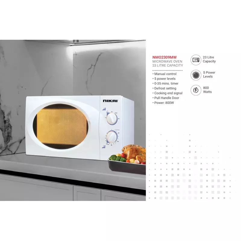 Nikai Microwave 23L Manual 5 Power Levels 800W NMO2309MW 35 Mins Timer Defrost Settings Cooking End Signal Pull Handle Door