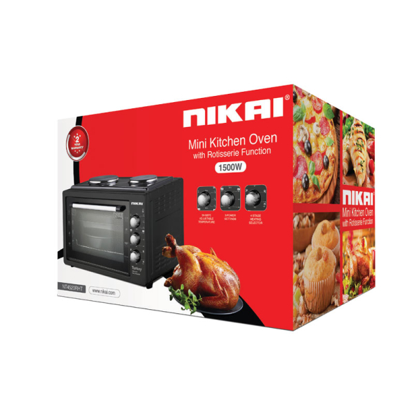 Nikai Oven Electric 45l with Rosting Function and 2 Hotplate NT4520RHT 60 Mins Timer Stainless Steel Heating Elements Inner Light