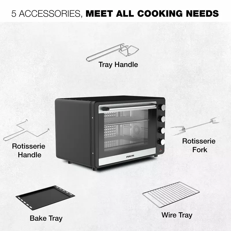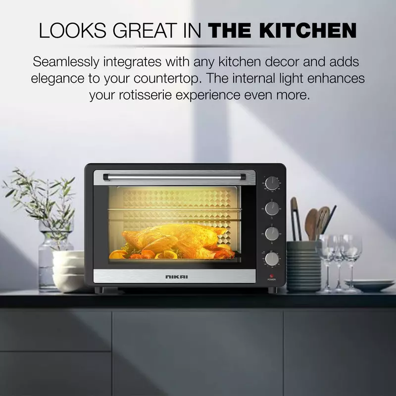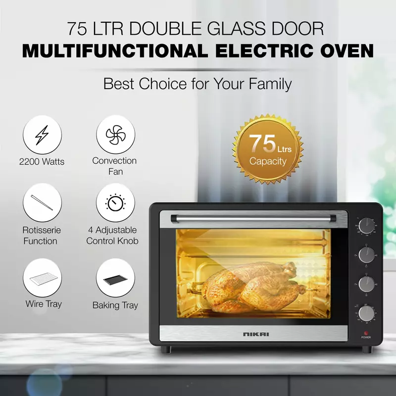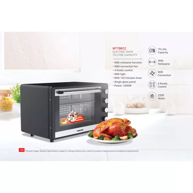 Nikai Oven Electric 75L With Rosting Function 4 Knobs Control 2200W NT75RCZ 120 Mins Timer Convection Function Single Inner Light Glass Panel