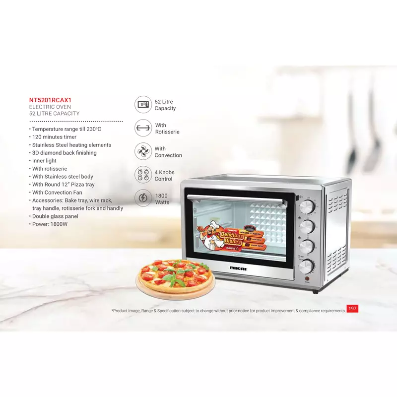 Nikai Oven Electric 52L With Rosting Function 4 Knobs Control 1800W NT5201RCAX1 120 Mins Timer Stainless Steel Heating Elements Inner Light Convection Fan Double Glass Panel