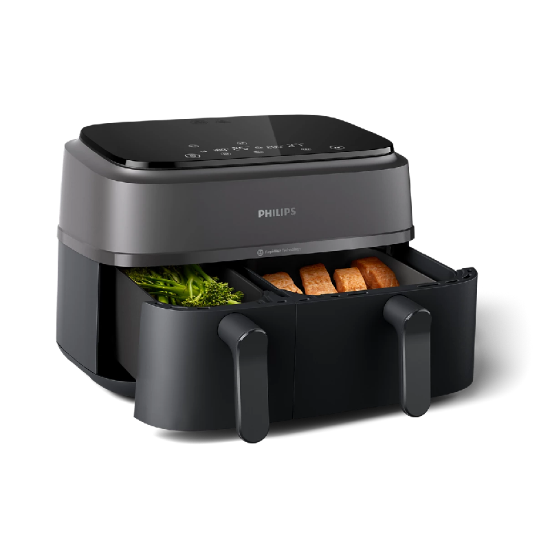 The Philips Airfryer from the 3000 series with two baskets ensures that two dishes are hot and ready at the same time. Enjoy tasty and healthy cooking with a large drawer for main courses for the whole family and a smaller drawer for side dishes or single meals.