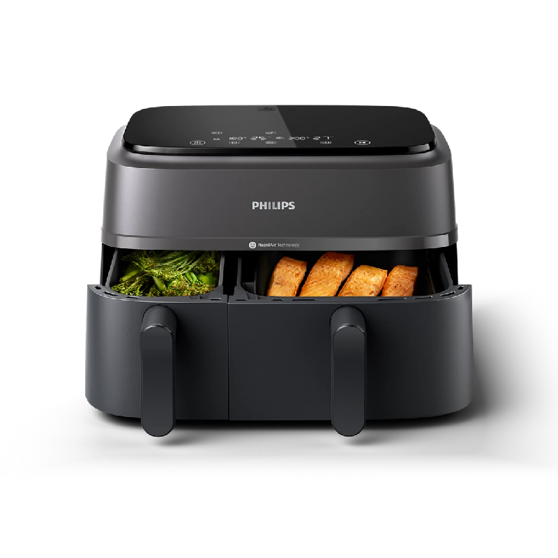 The best dual airfryer with tailored recipes in the HomeID app. Gives you step-by-step guidance and hundreds of mouthwatering meals with specific settings for your Dual Basket Airfryer.