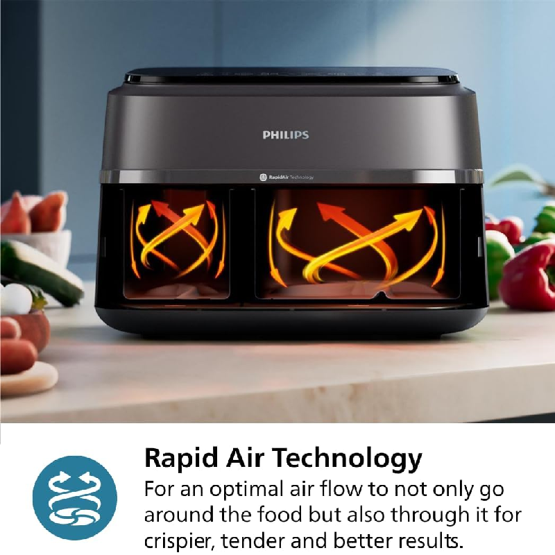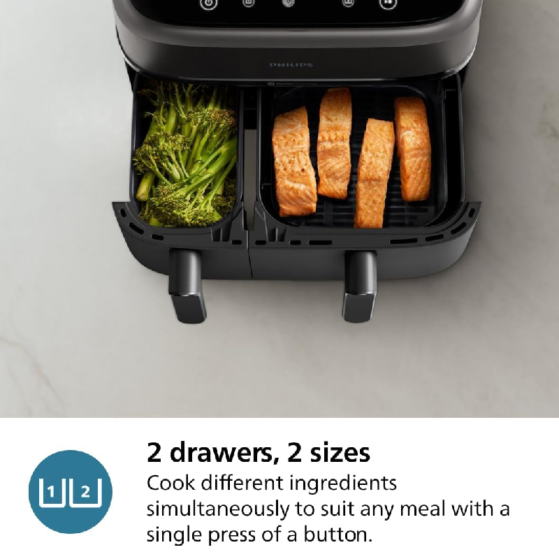 2 drawer air fryers: The large drawer is perfect for mains, fries, and whatever you love most. Use the smaller drawer for sides, veggies, and snacks.