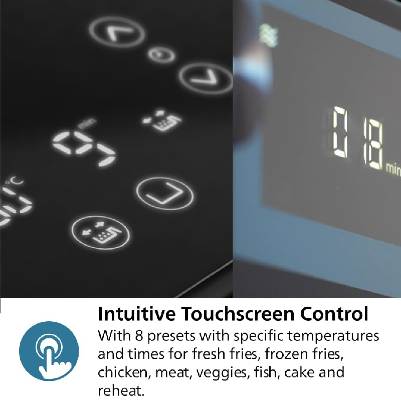 No more checking or guessing. With the touchscreen display, the dual basket airfryer has preset temperatures and times for fresh fries, frozen fries, chicken, meat, veggies, fish, cake, and reheat.