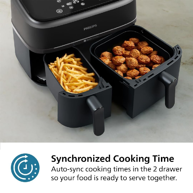 Automatically synchronize cooking times in 2 drawers, so all your food is ready to serve together. One meal, fresh and hot.