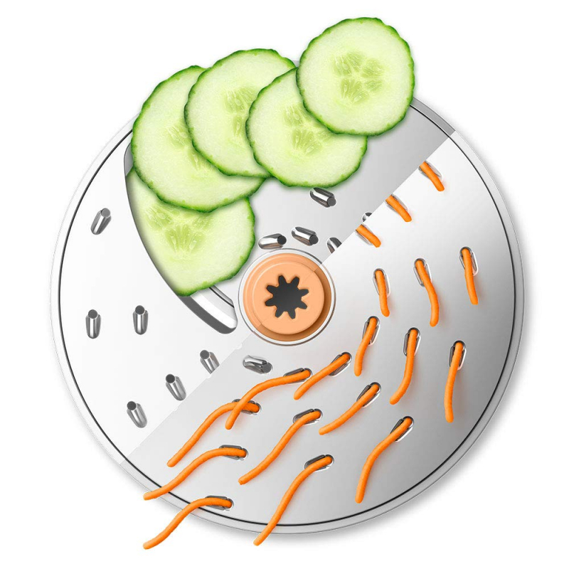 Ergonomic, double-sided disc makes it easy to slice with one side and shred with the other side!