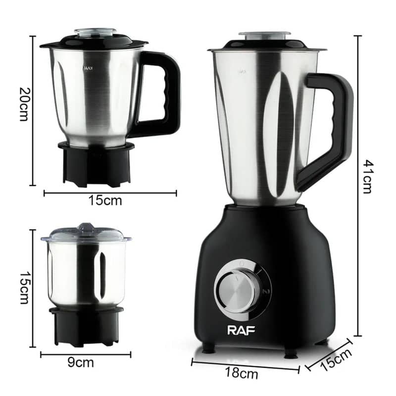 RAF Blender 1.5L Steel Jar, 1L Grinder, 0.8L Grinder, 350W, 3in1, 6 Blades, Strong Power, Fast Start, 2 Speed + Pulse Function R.2843
