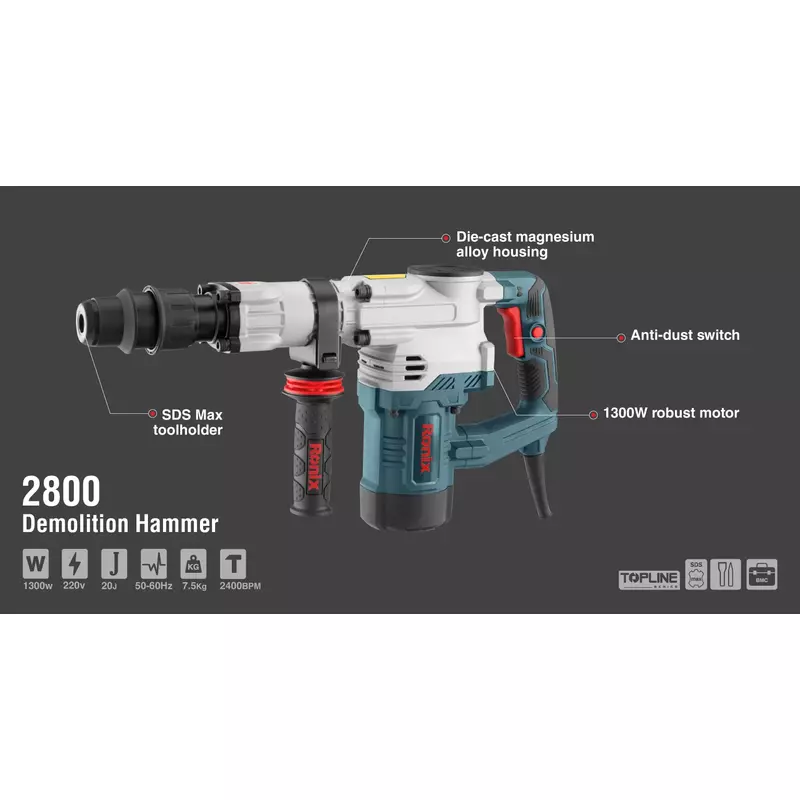 2800 comes in a BMC hard case including all the essential add-ons: an auxiliary Ronix-design handle, Grease pot, wiping cloth, SDS Max 250*350mm flat and an SDS Max 250*350mm pointed chisel bit.