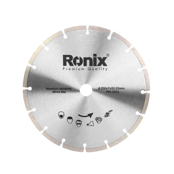RH-3523 like the other Ronix granite cutting discs, above mentioned, it has a 230mm wheel diameter, 22.2mm arbor, 7mm segment, can be applied for cutting granites and marbles.