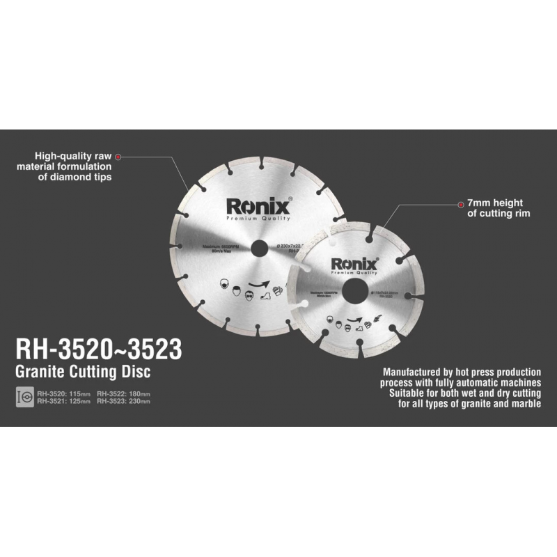 All these models (RH-3520, RH-3521, RH-3522, RH-3523) are manufactured by a hot press production process with a fully automatic machine which ensures faster cut and longer lifetime. Ronix Granite Cutting Disc is manufactured by high-quality material which optimizes cutting performance and ensures durability. High-quality raw material formulation of diamond tips minimizes the friction and delivers a faster and cooler cut and provides toughness and good performance for cutting on granites and marbles.