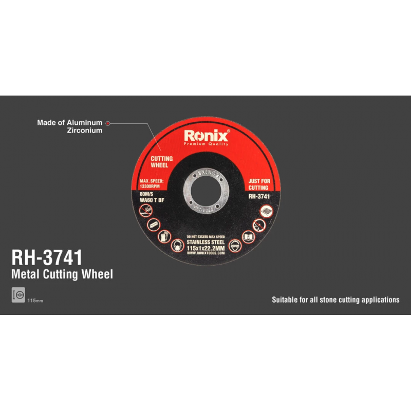 The Ronix RH-3723, RH-3703 and RH-3732 are used for cutting steel. To cover a wide range of cutting applications, they are manufactured in different sizes; 115mm, 180mm and 230mm. They all also have Aluminum Oxide components for better performance. On the other hand, the Ronix RH-3741 and RH-3742 are used for cutting INOX and they are 115mm and 180mm in diameter. They also have Aluminum Zirconium components that enhance cutting operation. Furthermore, the Ronix 3712 Cutting Wheel can be applied for building materials like concrete, marble and stone. This cutting disc has a diameter of 355mm and its component is Silicone Carbide.