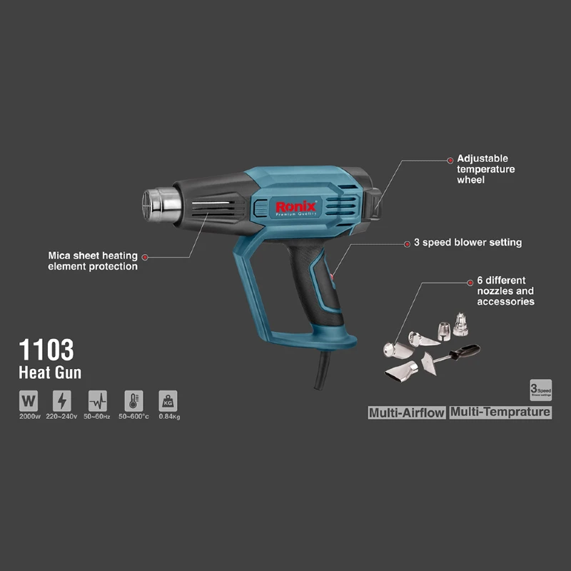The Ronix 1103 Industrial Heat Gun is designed to take on a whole host of DIY tasks. Therefore, it is equipped with a super powerful 2000 W motor, which provides adequate power and quickly heats up to 600℃ in a few seconds. Safety-wise, by including the built-in overload protection system inside the heat gun, overheating during constant work is the first of never. The way this mechanism works is by shutting the elements down for a few seconds in case of overheating. Ronix heat guns are also equipped with a Constant Heat Control system, which constantly controls the working temperature by shutting the elements down and turning them on to stabilize the temperature to the desired amount during continuous work. These two mechanisms make your heat gun safer, and more reliable, and also extend the service life. This device is built to be as dynamic as you need it to be. To satisfy all the users’ needs, it includes 7 temperature settings from 50℃ to 600℃, which are easily adjustable by a wheel designed at the back of the device. Not all jobs are alike, and Ronix experts take that to heart when designing heat guns. In addition to the temperature settings, 1103 is equipped with 3 airflow speed control (1st:250L/min, 2nd:250L/min, 3rd:500L/min) to satisfy all the requirements. The ability to customize your temperature and airflow speed can give you great dominance over the job you performing and decrease the risk of any damage to the workpiece to the least.