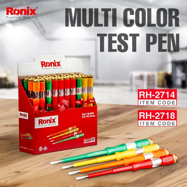 Multi-color Test Pen RH-2714 / RH-2718 is going to be the coolest, high-quality    electrometric voltage light test pen you have ever had! Its stainless-steel rod has been designed to increase the lifetime of your hand tool. It is designed ergonomically with its non-slip handles and nickel-coated tips to amaze you both in voltage testing and screwing!