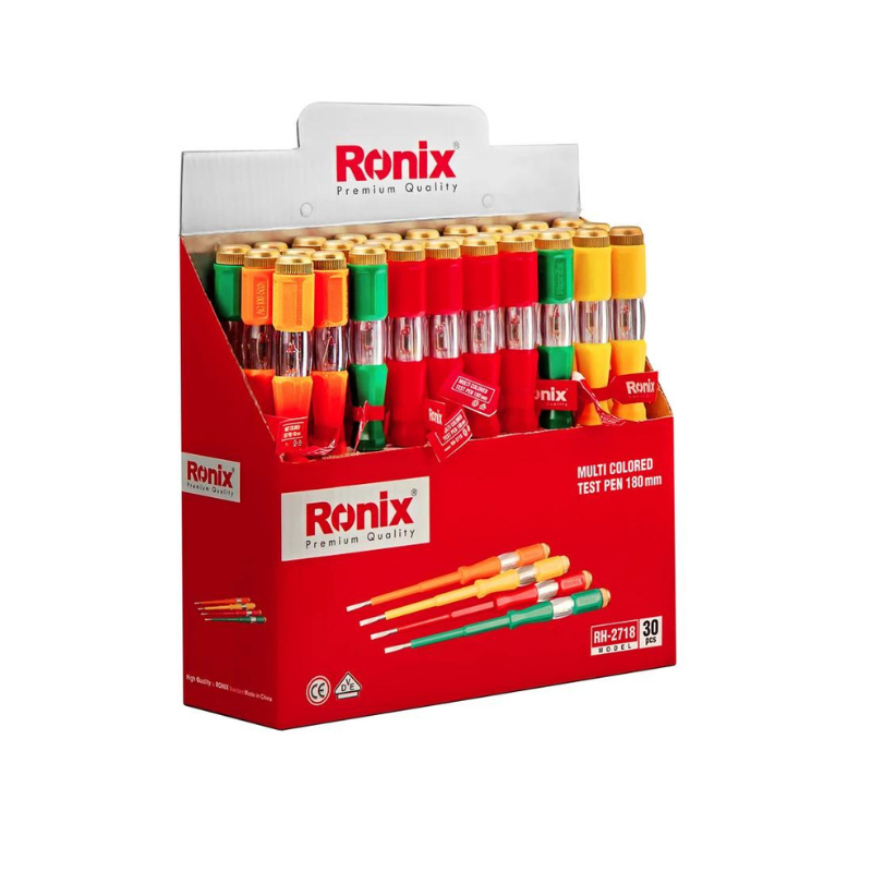 Handles These ergonomic, multi-color electrometric voltage light test pens are designed to deliver a technical proficiency according to the Ronix high standards. For gripping the tool easily and effortlessly we have designed a non-slip handle made from ABS environmental plastic. We have also insulated an ABS plastic cover on its handle so you wouldn’t need to worry about your safety while doing electronic operations. The light placed in its handle is made of high-quality xenon so it will keep its visibility even in intense light! A copper cap is also placed after the lightbox to improve the efficiency of the test pen. RH-2714 / RH-2718 are two great products with the dimension of 140mm and 180mm. They both meet the BS, EN and ASDN standards and that will leave no rooms for any doubts. Just take your multi-color test pen RH-2714 / RH-2718 in a display color box, select your favorite color and enjoy your colorful electrometric light test pen and screwdriver all at once!