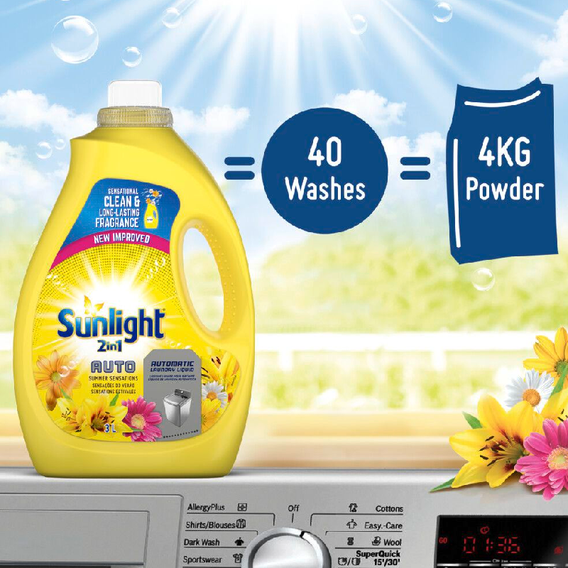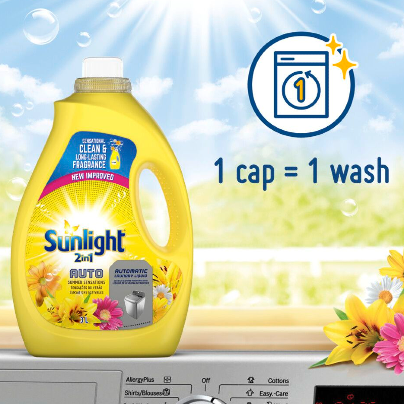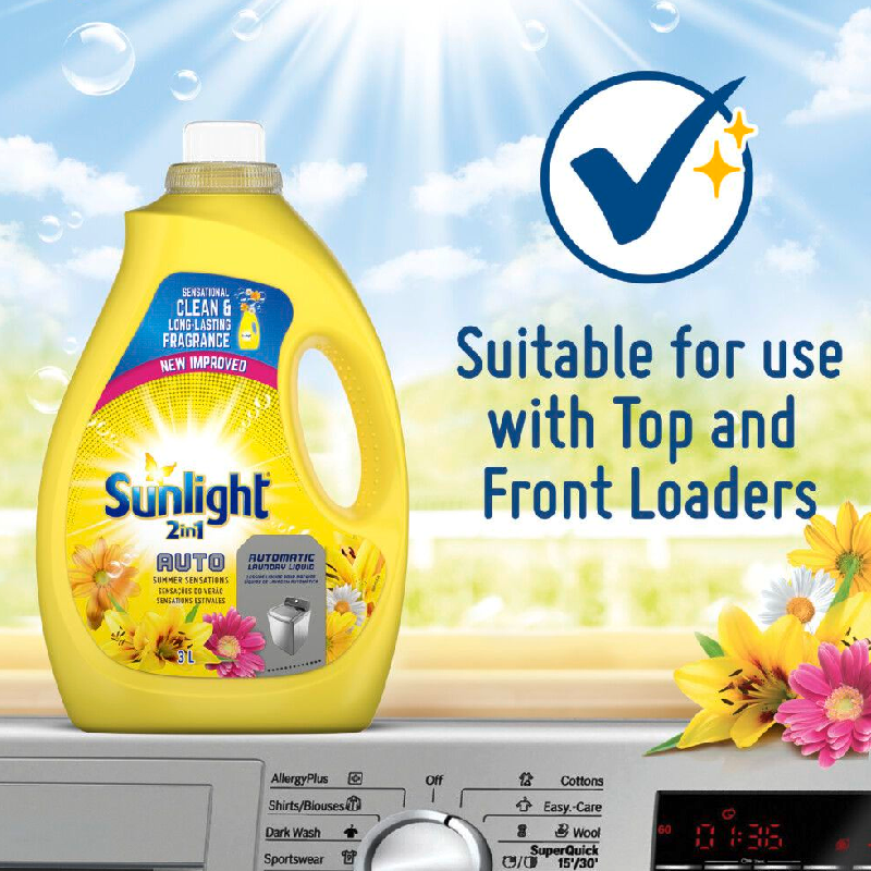 Sunlight Summer Sensations 2in1 Auto Washing Liquid Detergent is a fabric conditioner and washing powder in one. No need to buy two separate laundry products.