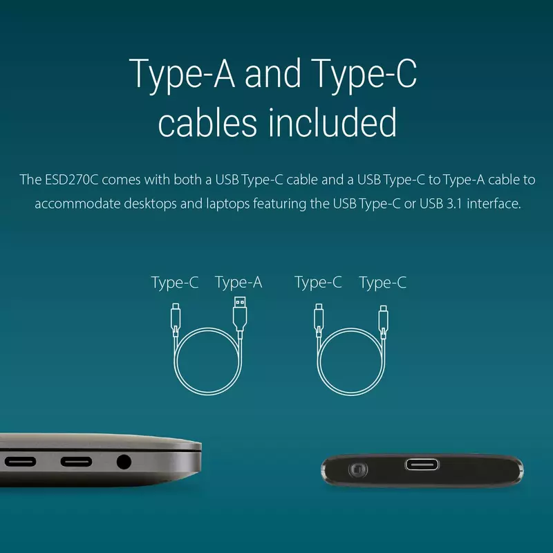 The ESD270C comes with both a USB Type-C cable and a USB Type-C to Type-A cable to accommodate desktops and laptops featuring the USB Type-C or USB 3.1 interface.