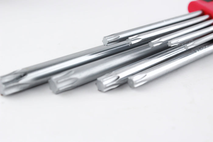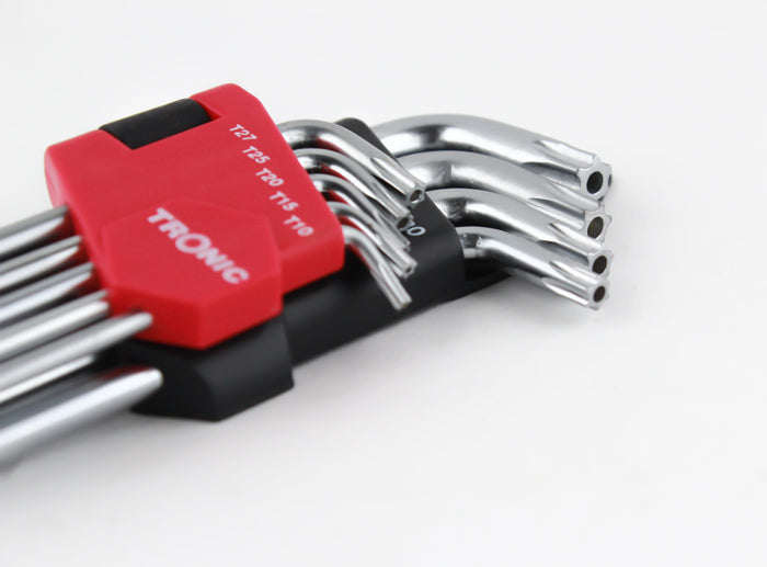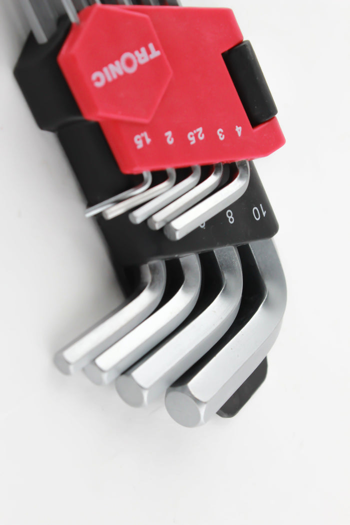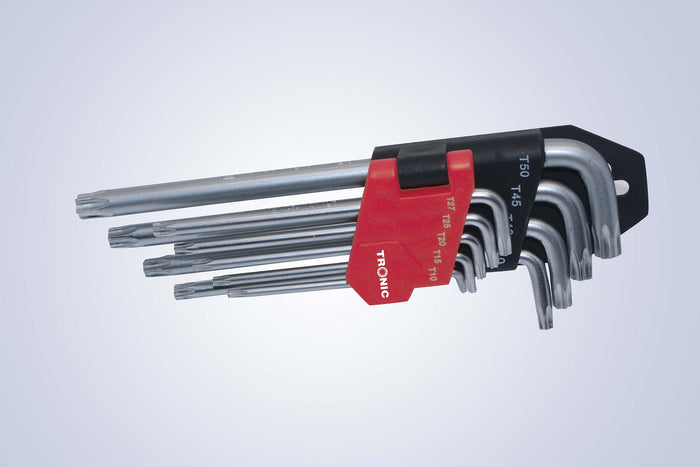 It is an L-shaped metal bar with a hexagonal head at each end, used to turn bolts and screws having hexagonal sockets. Tronic double-ring hex key available in sizes T10 to T50.