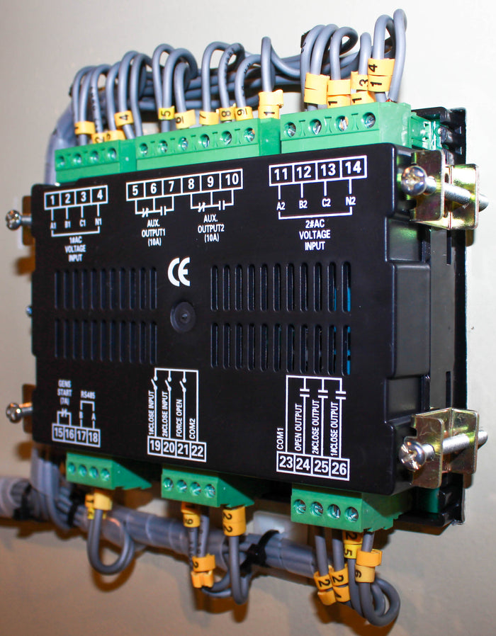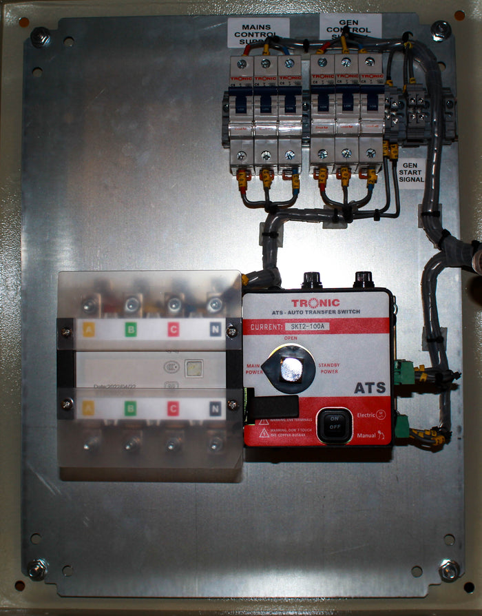 100A 4 pole automatic transfer switch unit which, in the event of a power outage, will automatically start a generator and transfer the load over to the Generator supply. When the Main supply returns to normal, the ATS will transfer the load back to the Main supply and shut down the generator.