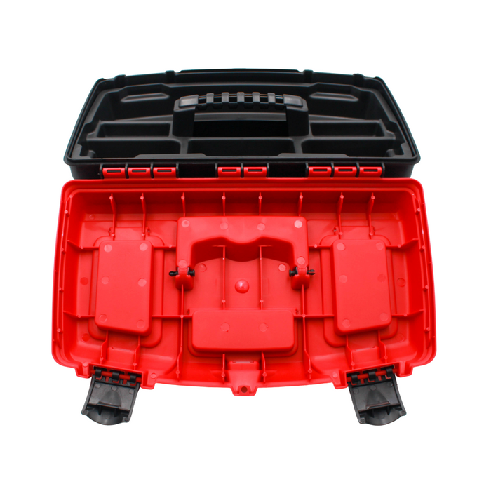 This toolbox is 17 inches in size and is made from PVC making it lightweight and easy to carry around. It has small compartments at the top for small bits and screws that would usually get lost easily in the general toolbox compartment. On the inside, there are two compartments to better organize your tools.