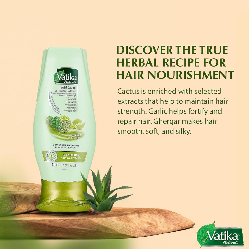 • KEY INGREDIENTS: Discover the secret herbal recipe for intensive nutrition in Vatika’s nourishing conditioner. The natural extracts of garlic, cactus, and gergir help reduce hair fall due to breakage while enriching each strand to make hair strong and smooth, nourishing hair from root to tip.