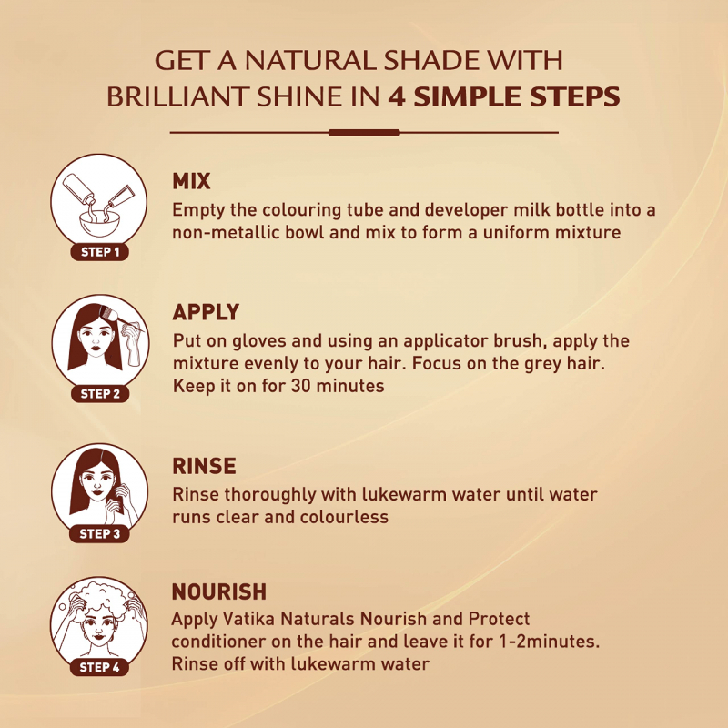 Indulge in natural-looking hair with brilliant shine in 4 simple steps – Mix, Apply, Rinse & Nourish! Get 100% grey coverage with rich color in 30 minutes.