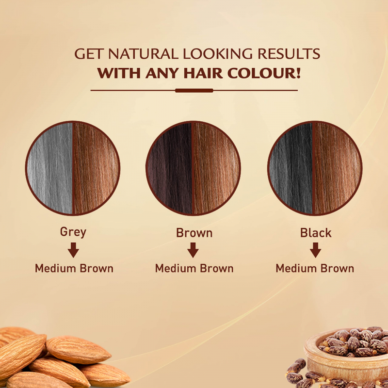 This natural hair color gives your grey hair a 100% natural medium brown look. Enriched with castor oil, almond & honey, this no-ammonia hair color, infused with natural oils supports hair growth, while giving your hair a silky-soft and shiny look. This natural hair color for women coats and seals essential moisture into hair strands and gives your hair a rich color in 30 minutes.
